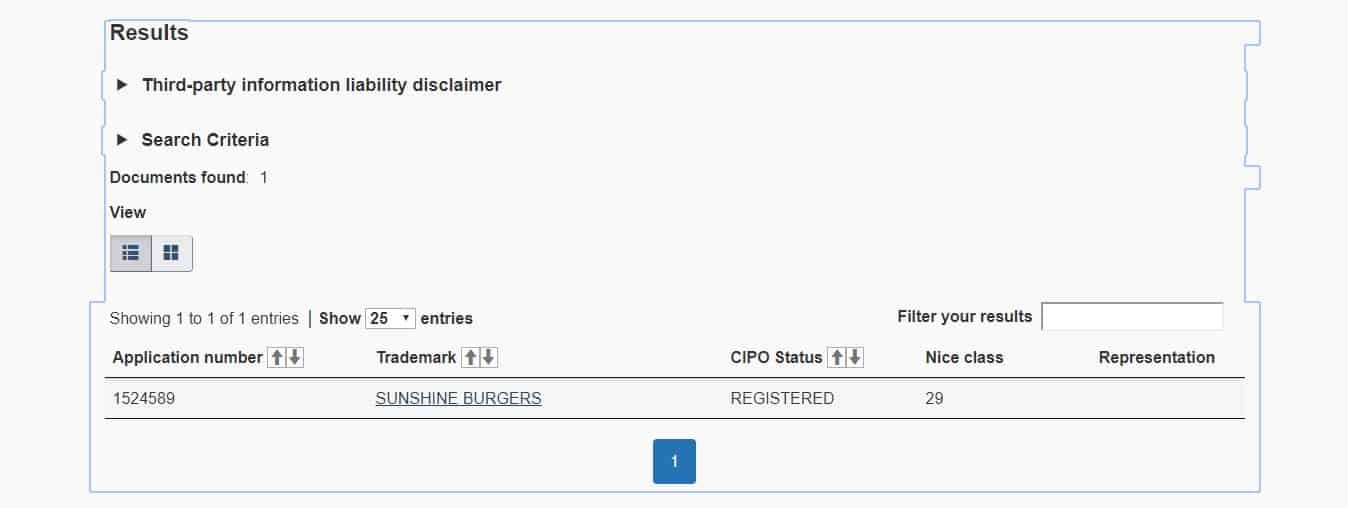 Looking at the results, you can see that the word mark "Sunshine Burgers" is already a registered trademark.