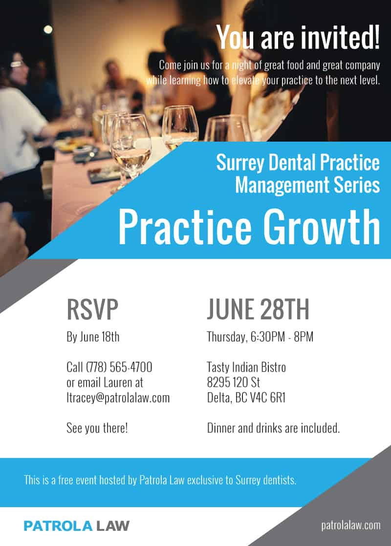 We are pleased to announce the inaugural “Surrey Dental Practice Management Series: Practice Growth” seminar scheduled on June 28th, from 6:30pm to 8:00pm, at Tasty Indian Bistro. Dinner and drinks are included.